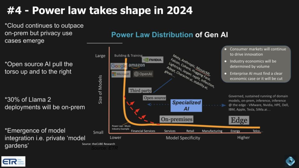 Таким образом, наш анализ показывает, что, хотя облачные гиганты в настоящее время доминируют в сфере искусственного интеллекта нового поколения, многие публичные компании проявляют значительное стремление к локальному и частному развертыванию в облаке из-за конфиденциальности данных и проблем регулирования. Мы прогнозируем, что в 2024 году отрасль увидит, как формируются ранние стадии степенного закона с длинным чередом специализированных ИИ и растущим акцентом на суверенитет данных. Ожидается, что со временем эта тенденция станет более выраженной, подчеркивая разнообразный и развивающийся ландшафт искусственного интеллекта нового поколения.