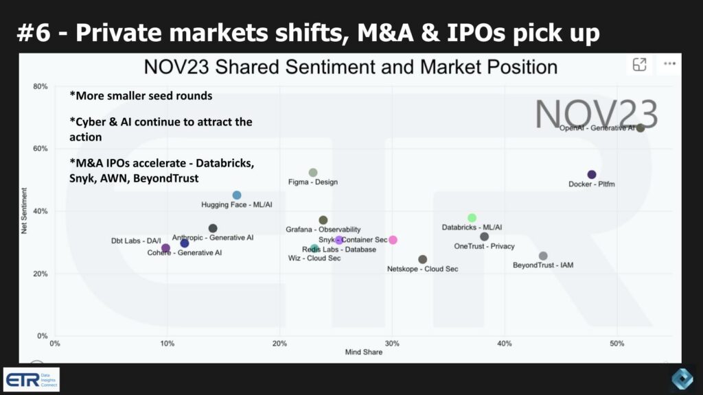 - Мы прогнозируем ускорение процессов слияний и поглощений и IPO в технологическом секторе. Такие компании, как Databricks, Snyk, Arctic Wolf и BeyondTrust, являются вероятными кандидатами на проведение IPO после сокращения числа IPO в прошлом году.