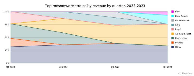 Мы можем видеть некоторые из этих разновидностей на графике ниже, который показывает наиболее активные разновидности программ-вымогателей по кварталам с начала 2022 по 2023 год.