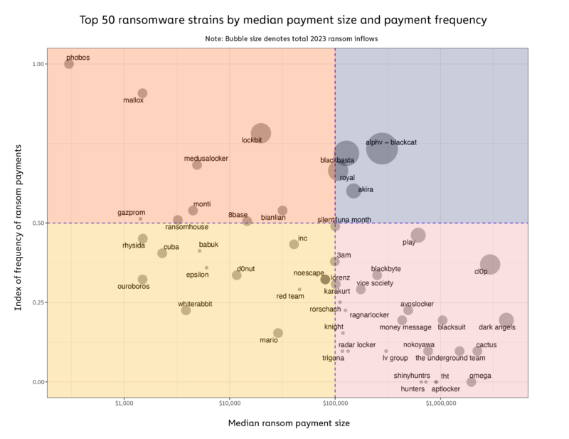 Мы также можем видеть существенные различия в стратегиях виктимизации ведущих штаммов программ-вымогателей на приведенной ниже диаграмме, на которой показан средний размер выкупа каждого штамма в зависимости от частоты атак. На диаграмме также показаны многочисленные новые участники и ответвления в 2023 году, которые, как мы знаем, часто повторно используют код существующих штаммов. Это говорит о растущем числе новых игроков, привлеченных потенциалом получения высокой прибыли и более низкими барьерами для входа.
