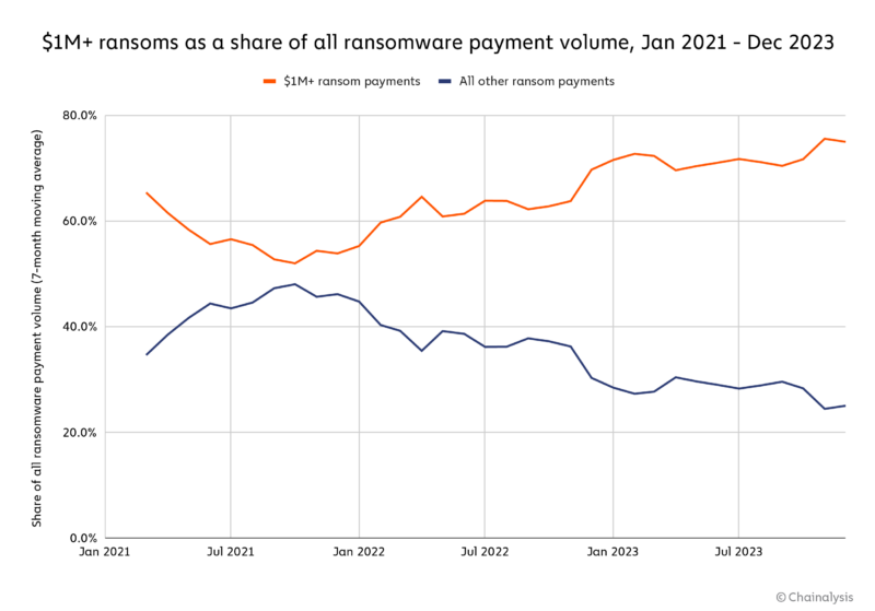 В целом, охота на крупную дичь стала доминирующей стратегией за последние несколько лет, при этом все большая и большая доля всего объема платежей за программы-вымогатели приходится на выплаты в размере 1 миллиона долларов и более.