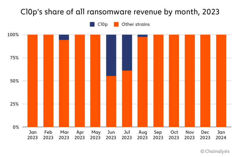 Кампания MOVEit от Cl0p позволила ему на какое-то время стать самым заметным штаммом во всей экосистеме, собрав более 100 миллионов долларов в виде выплат выкупа и составив 44,8% от всей стоимости программ-вымогателей, полученных в июне, и 39,0% в июле.