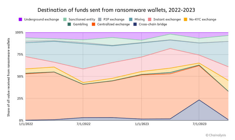 Централизованные биржи и микшеры неизменно составляли значительную долю транзакций, что позволяет предположить, что они являются предпочтительными методами отмывания платежей с помощью программ-вымогателей.