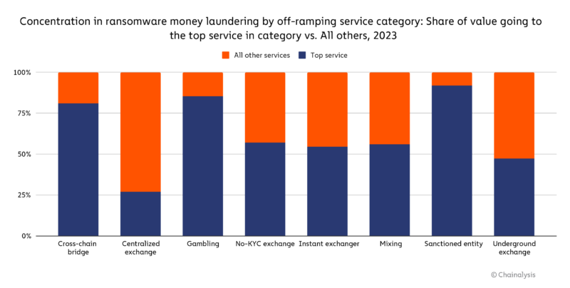 Биржи продемонстрировали самый низкий уровень концентрации, в то время как игорные сервисы, перекрестные переходы и организации, подпадающие под санкции, продемонстрировали самый высокий уровень концентрации. Микшеры, биржи без KYC и подпольные биржи оказались посередине: примерно половина всех средств, отправленных в каждую категорию с кошельков программ-вымогателей, поступила в один сервис. Концентрация микшеров, возможно, увеличилась в результате демонтажа Chipmixer, который устранил популярный вариант для злоумышленников-вымогателей. В целом, такая чрезмерная концентрация может привести к возникновению у участников вымогательства узких мест, которые делают их уязвимыми, поскольку правоохранительные органы могут существенно нарушить операции, отключив относительно небольшое количество сервисов.