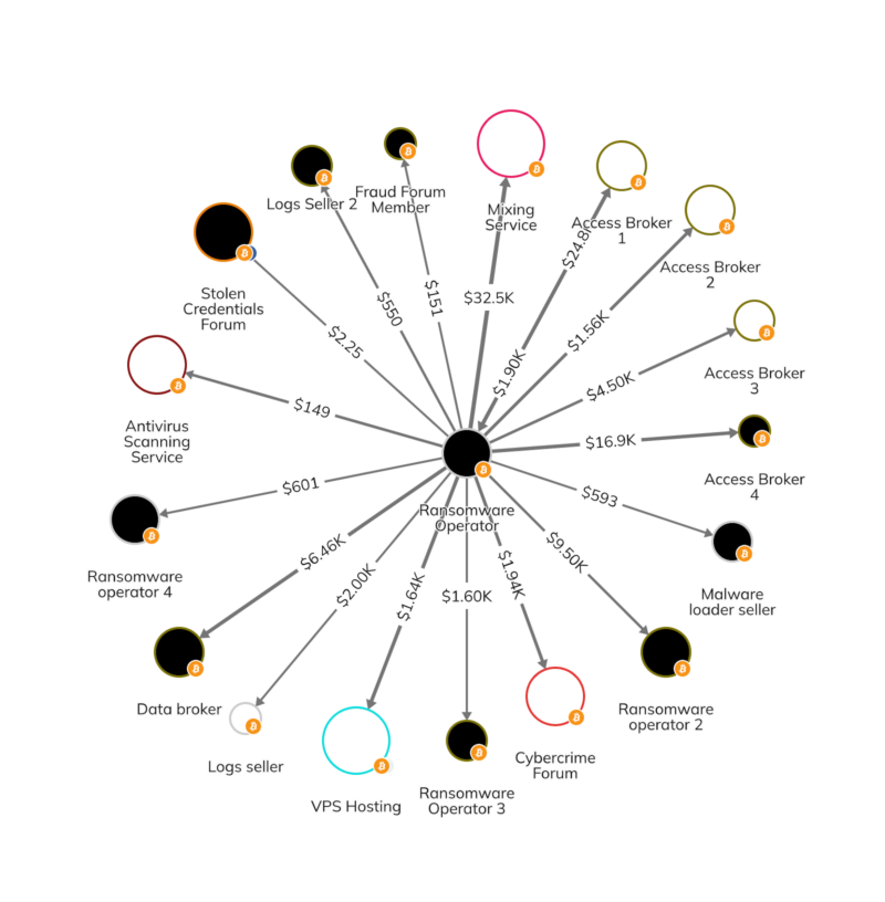 Примеры такой активности мы можем видеть на графике Reactor ниже, на котором оператор программы-вымогателя отправляет средства нескольким IAB и другим поставщикам инструментов, полезных для атак программ-вымогателей.