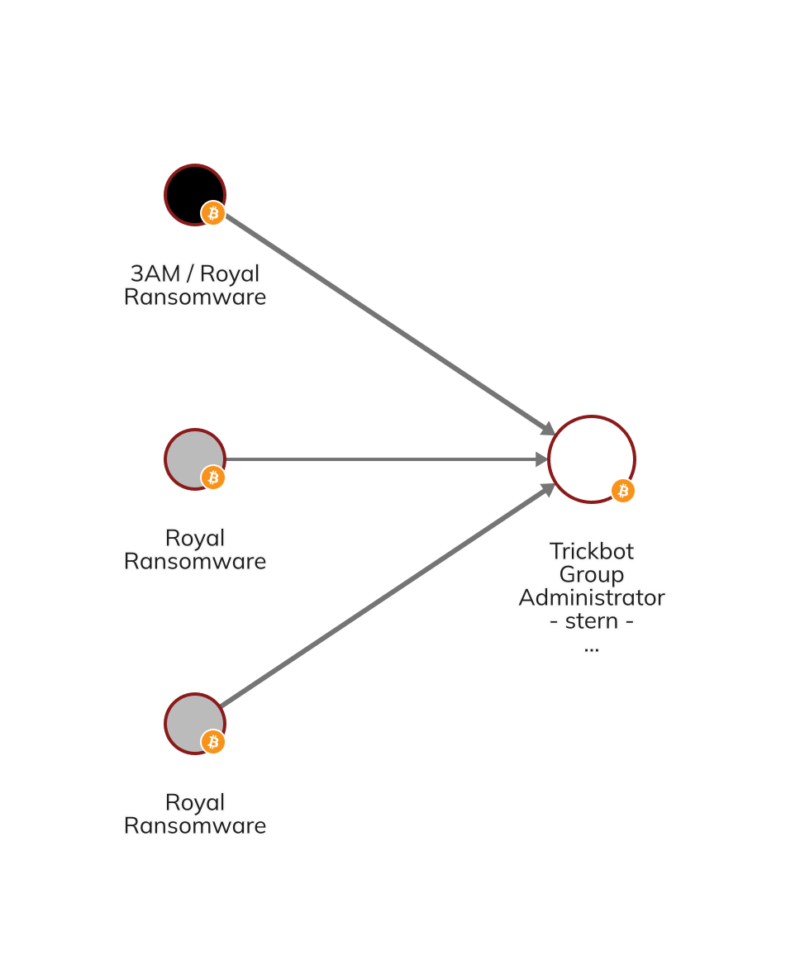 К счастью, анализ блокчейна позволяет выявлять ребрендинги программ-вымогателей, показывая сетевые связи между кошельками, казалось бы, разных типов. Мы можем видеть пример на графике Chainalysis Reactor ниже, который показывает связи между администратором Trickbot, известным как Stern, Royal ransomware, и его более новой итерацией, известной как 3am.
