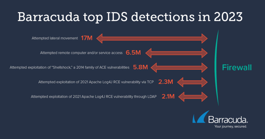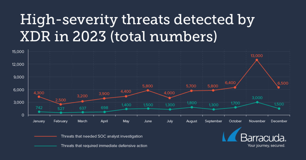 В 2023 году Barracuda XDR, включая свою команду аналитиков SOC, находящихся на круглосуточном дежурстве, проанализировала почти два триллиона (1,640 миллиарда) ИТ-событий, чтобы изолировать десятки тысяч потенциально опасных угроз безопасности.