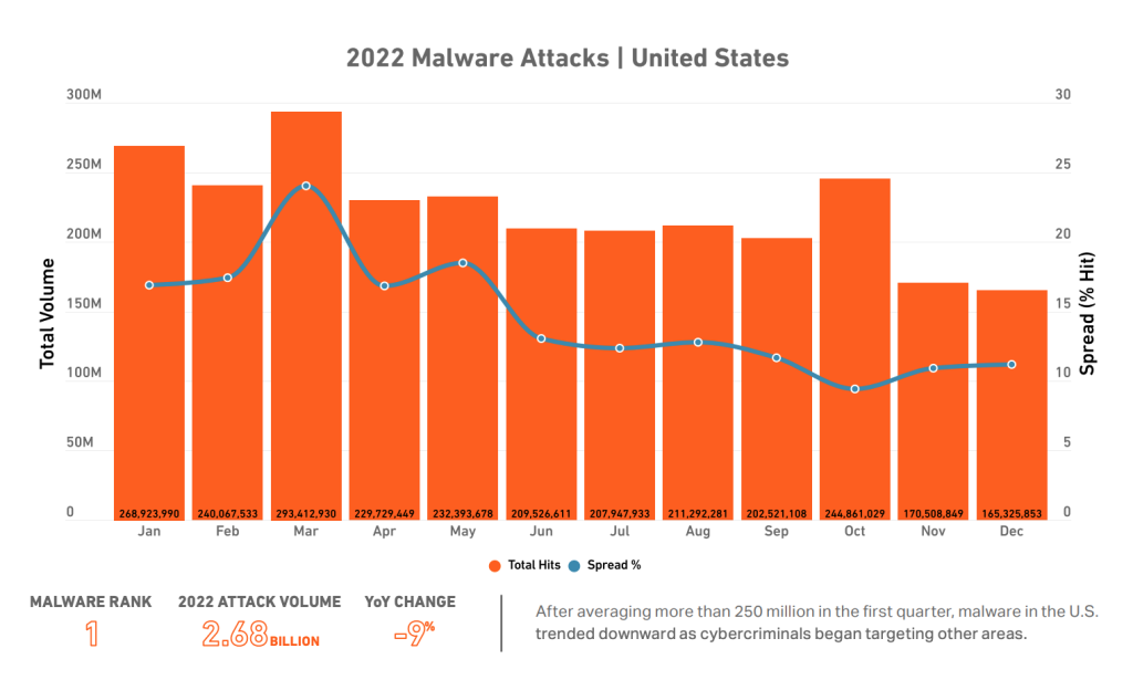 Согласноотчету Sonic Wall о киберугрозах за 2023 год, Соединенные Штаты занимают первое место в списке с наибольшим объемом атак вредоносного ПО на общую сумму 2,68 миллиарда.