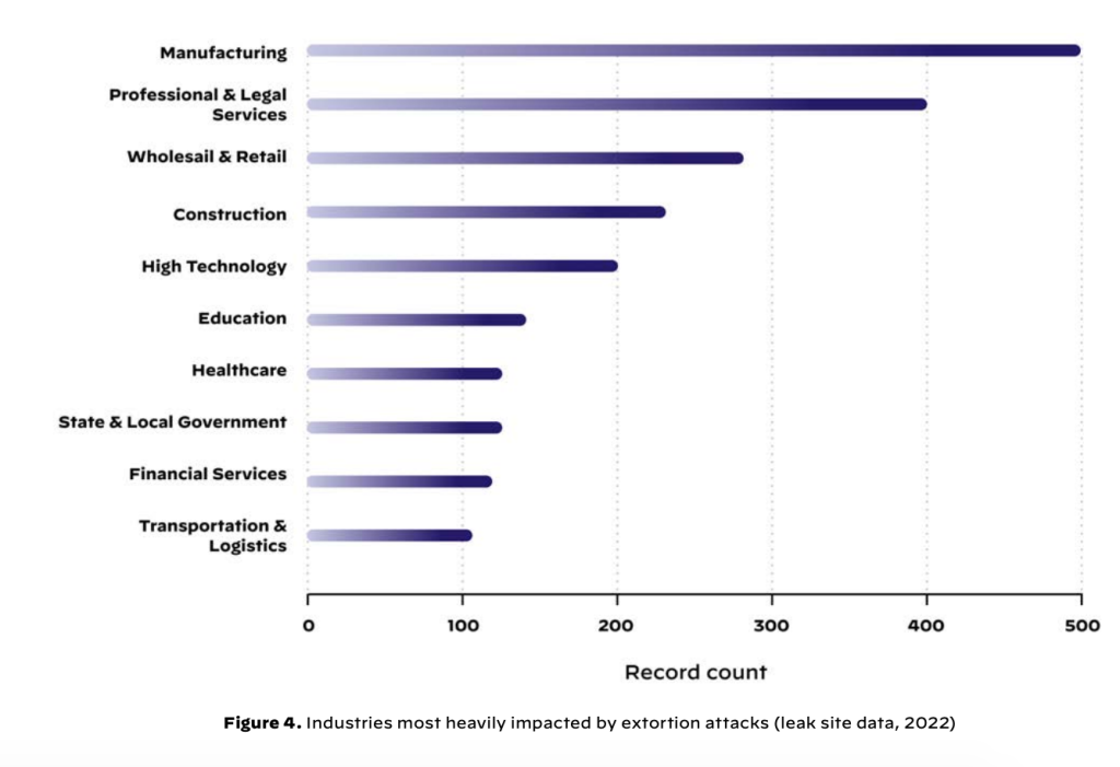 Между тем, в 2022 году обрабатывающая промышленность значительно пострадала от нападений с вымогательством: 447 зарегистрированных жертв на разных платформах.