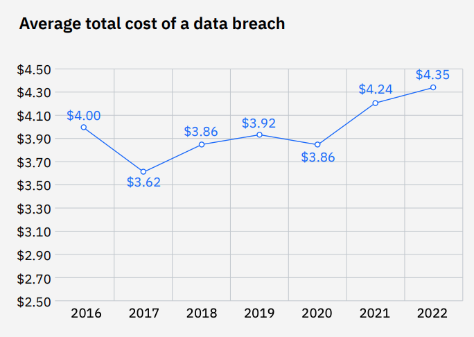 - Средняя глобальная стоимость утечки данных составила 4,35 миллиона долларов в 2022 году.