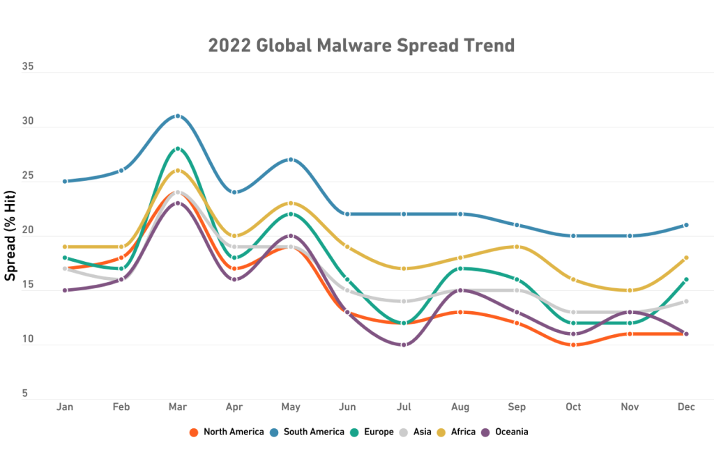 Интересно, что объем вредоносного ПО в Северной Америке значительно снизился на 10% в годовом исчислении, в результате чего в общей сложности было зарегистрировано 2,75 миллиарда экземпляров.