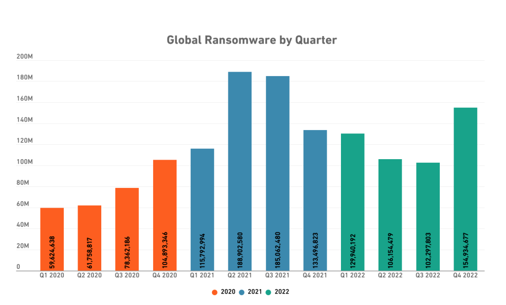 По данным SonicWall, в 2022 году было совершено 493,3 миллиона попыток вымогательства, что демонстрирует заметное снижение на 21% по сравнению с аналогичным периодом прошлого года.