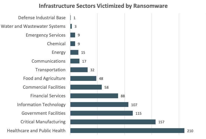 Среди 16 критически важных секторов инфраструктуры отчетность IC3 показала, что в 14 секторах по крайней мере один участник стал жертвой атаки программ-вымогателей.