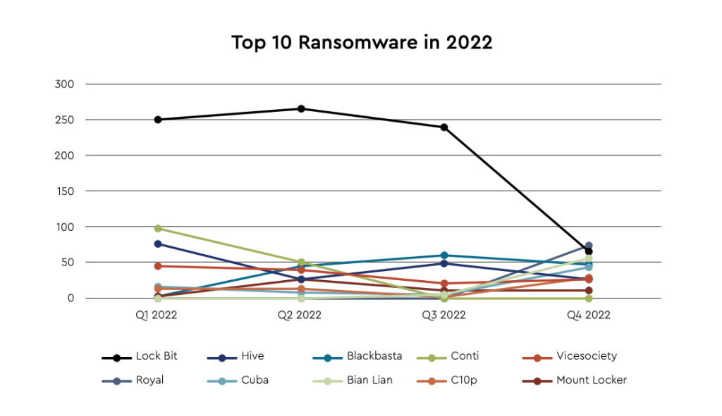 LockBit, ALPHV / Blackcoats и Hive были тремя преобладающими вариантами программ-вымогателей, о которых сообщалось IC3 и которые были нацелены на представителей критически важных секторов инфраструктуры.