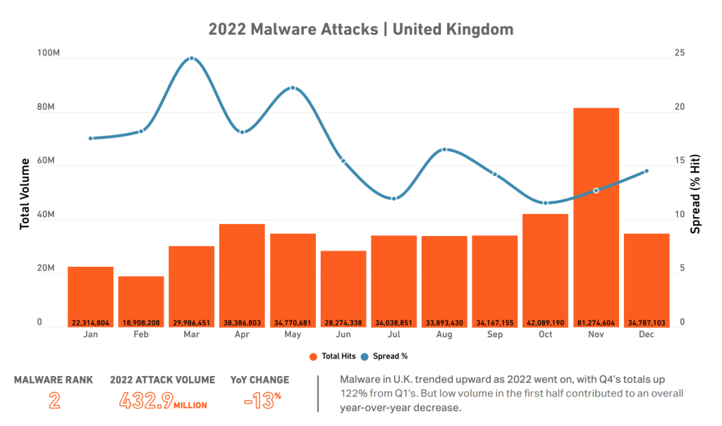 Великобритания занимает второе место по наибольшему объему атак вредоносного ПО, сообщив о 432,9 миллионах атак в 2022 году.