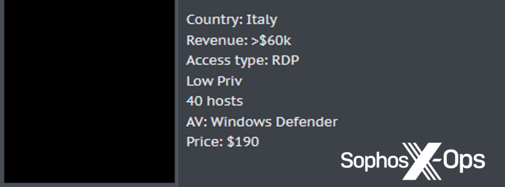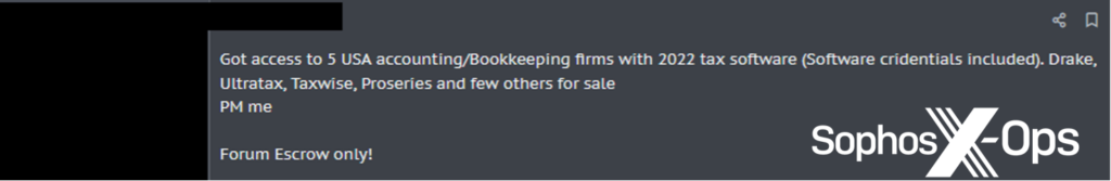 Украденные учетные данные, включая файлы cookie браузера, могут быть использованы для компрометации деловой электронной почты, доступа к сторонним сервисам, таким как облачные финансовые системы, и доступа к внутренним ресурсам, которые могут быть использованы для мошенничества или получения другой денежной выгоды. Они также могут быть проданы “брокерами доступа” любому, кто захочет их использовать; Sophos отслеживала предложения на подпольных форумах, утверждающих, что они предоставляют доступ к ряду сетей малого и среднего бизнеса.