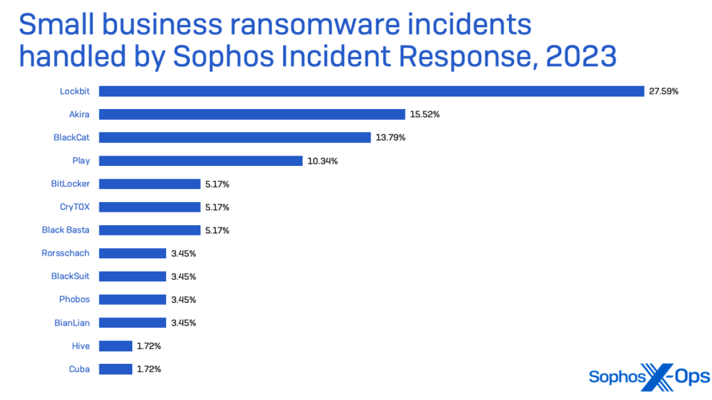 В 2023 году более 75% обращений клиентов по реагированию на инциденты, рассмотренных службой реагирования на инциденты X-Ops компании Sophos, касались малого бизнеса. Данные, собранные по этим случаям, в дополнение к телеметрии, полученной от клиентов нашего программного обеспечения для защиты малого и среднего бизнеса, дают нам дополнительную уникальную информацию об угрозах, которые ежедневно преследуют эти организации.