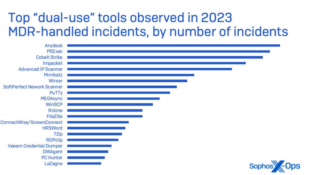 AnyDesk и PsExec были замечены в большем количестве инцидентов со стороны Sophos MDR, чем Cobalt Strike, как показано ниже: