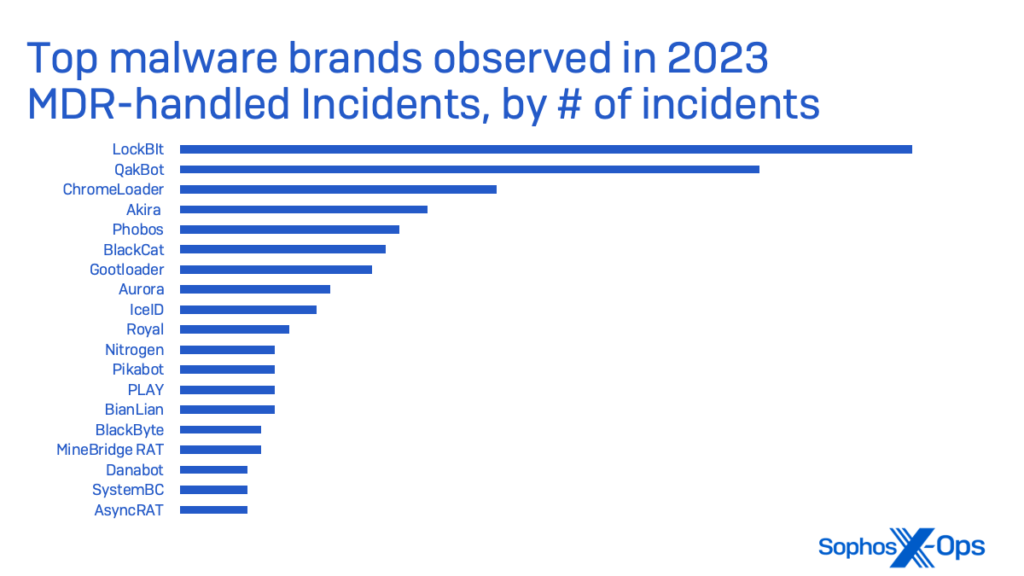 Группа Sophos по управляемому обнаружению и реагированию (MDR) больше всего обнаружила вредоносное ПО LockBit (в которую входит группа реагирования на инциденты и ее данные) — почти в три раза больше инцидентов с попытками внедрения программ-вымогателей, чем ближайший аналог Akira.