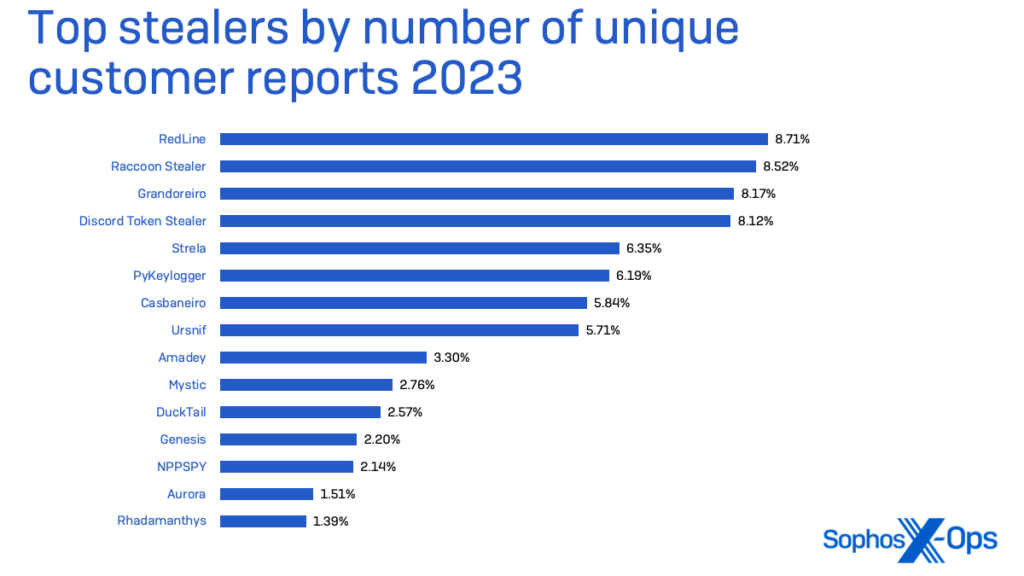 По категориям почти половина вредоносных программ, обнаруженных в 2023 году, были нацелены на данные предполагаемых жертв. Большую часть этого вредоносного ПО мы классифицировали как “крадущие” — вредоносное ПО, которое захватывает учетные данные, файлы cookie браузера, нажатия клавиш и другие данные, которые могут быть либо обращены в наличные в качестве проданного доступа, либо использованы для дальнейшей эксплуатации.