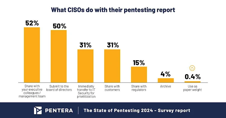 - По мере того, как Совет директоров (BoDs) становится все более осведомленным о кибербезопасности, более 50% CISO теперь делятся отчетами о пентестировании со своими BoDs.