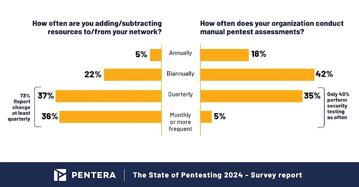 В опросе отмечается удручающий разрыв между частотой изменений ИТ-среды и частотой тестирования безопасности. В то время как 73% организаций сообщают о ежеквартальном внесении изменений в ИТ, только 40% соответствуют этому темпу своих усилий по тестированию. Это оставляет организации открытыми для рисков на длительные периоды.