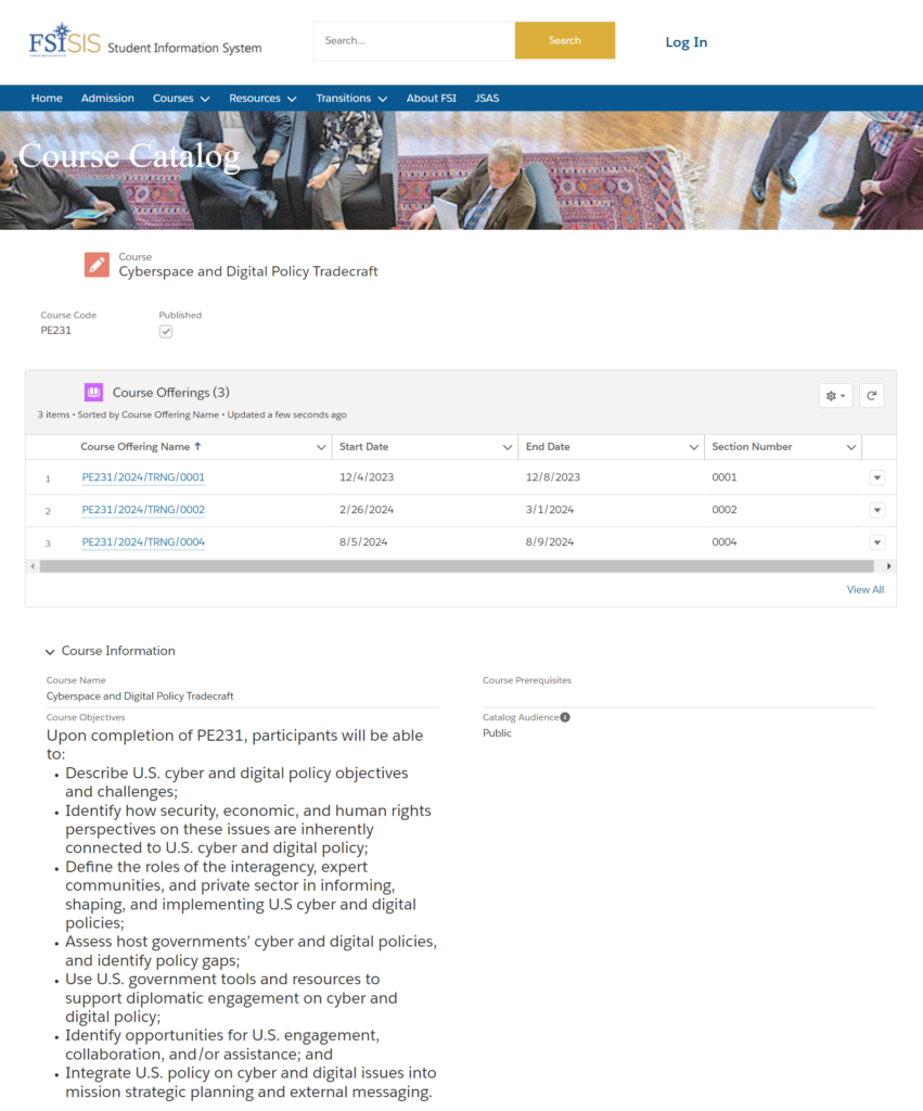 После нескольких месяцев исследований, планирования и составления расписания команда Фика запустила в Институте дипломатической службы курс «Киберпространство и цифровая политика» с тестовым запуском в ноябре 2022 года. С тех пор FSI проводила занятия еще шесть раз — один раз в Лондоне для европейских дипломатов, один раз в Марокко для дипломатов Ближнего Востока и Африки и четыре раза в Арлингтоне — и подготовила 180 дипломатов.