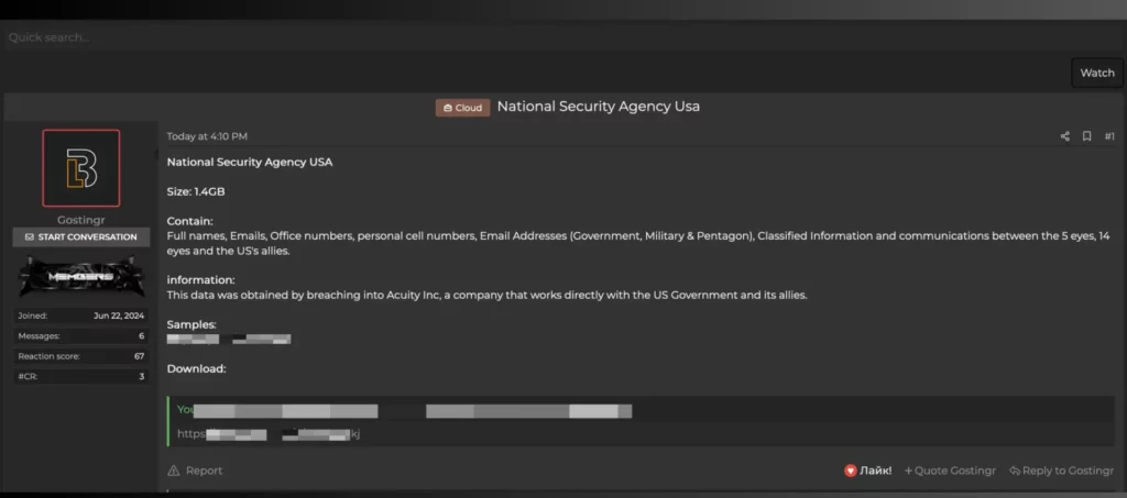 Во вторник, 9 июля 2024 года, мир кибербезопасности был потрясен новостью о масштабной утечке данных из Агентства национальной безопасности (АНБ) США. Исследователи из Cyber Press обнаружили файл объемом 1,4 ГБ, содержащий конфиденциальную информацию АНБ, который был выложен на известном форуме по утечкам данных.