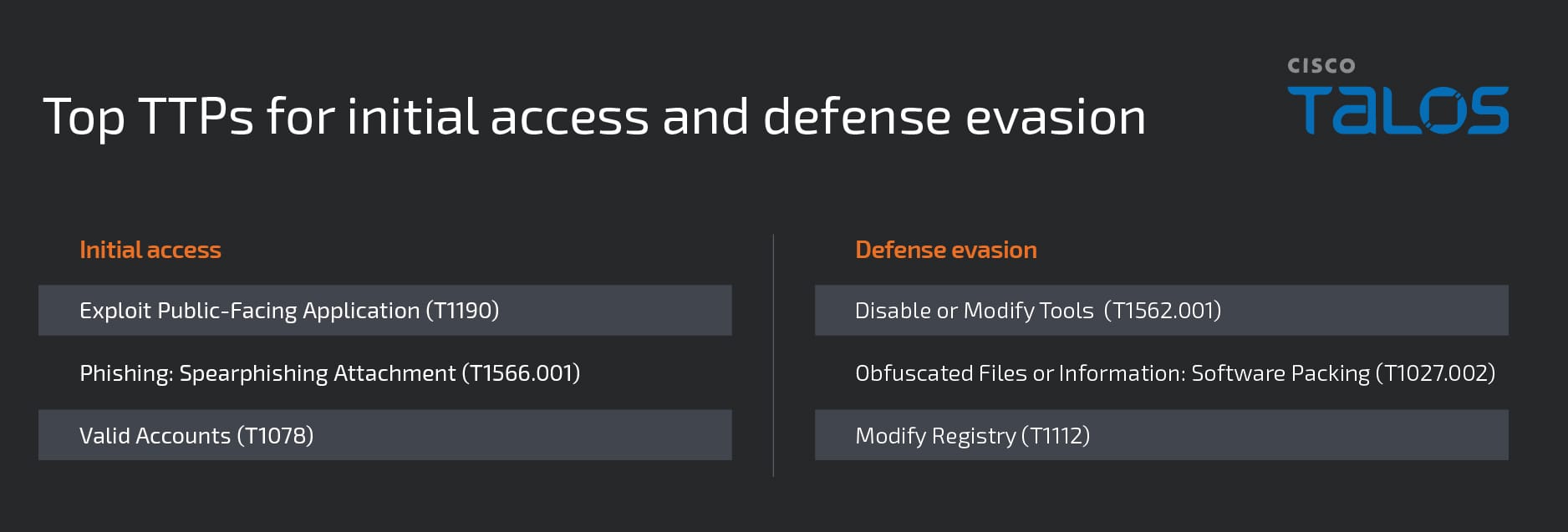 Анализ заданий Talos IR, посвященных использованию критических уязвимостей в общедоступных приложениях злоумышленниками-вымогателями, выявил три уязвимости для их повторного использования: CVE-2020-1472, CVE-2018-13379 и CVE-2023-0669. Использование этих и других критических уязвимостей может обеспечить первоначальный доступ и привести к повышению привилегий со стороны участников угрозы.