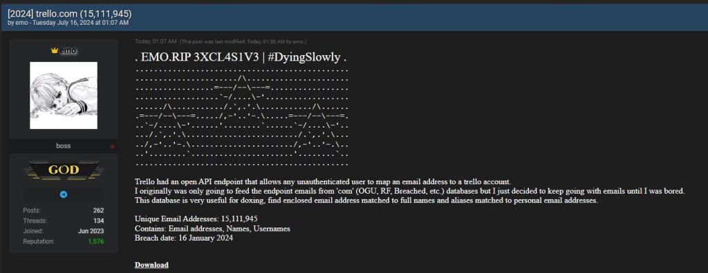 Trello, широко используемый инструмент управления проектами, разработанный Atlassian, столкнулся с серьезной утечкой данных, в результате которой была раскрыта конфиденциальная информация пользователя. Утечка обнаружилась недавно, когда хакер, использующий псевдоним “Emo”, слил 21,1 ГБ данных компании на печально известную платформу для хакеров и киберпреступности Breach Forums.