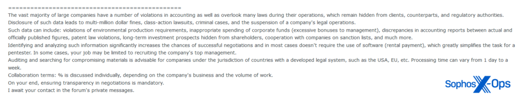 Рисунок 1: Злоумышленник размещает объявление о наборе на криминальном форуме, ища кого-то, кто будет искать «нарушения», «нецелевые расходы», «несоответствия» и «сотрудничество с компаниями из санкционных списков». Неясно, связано ли это конкретно с программами-вымогателями